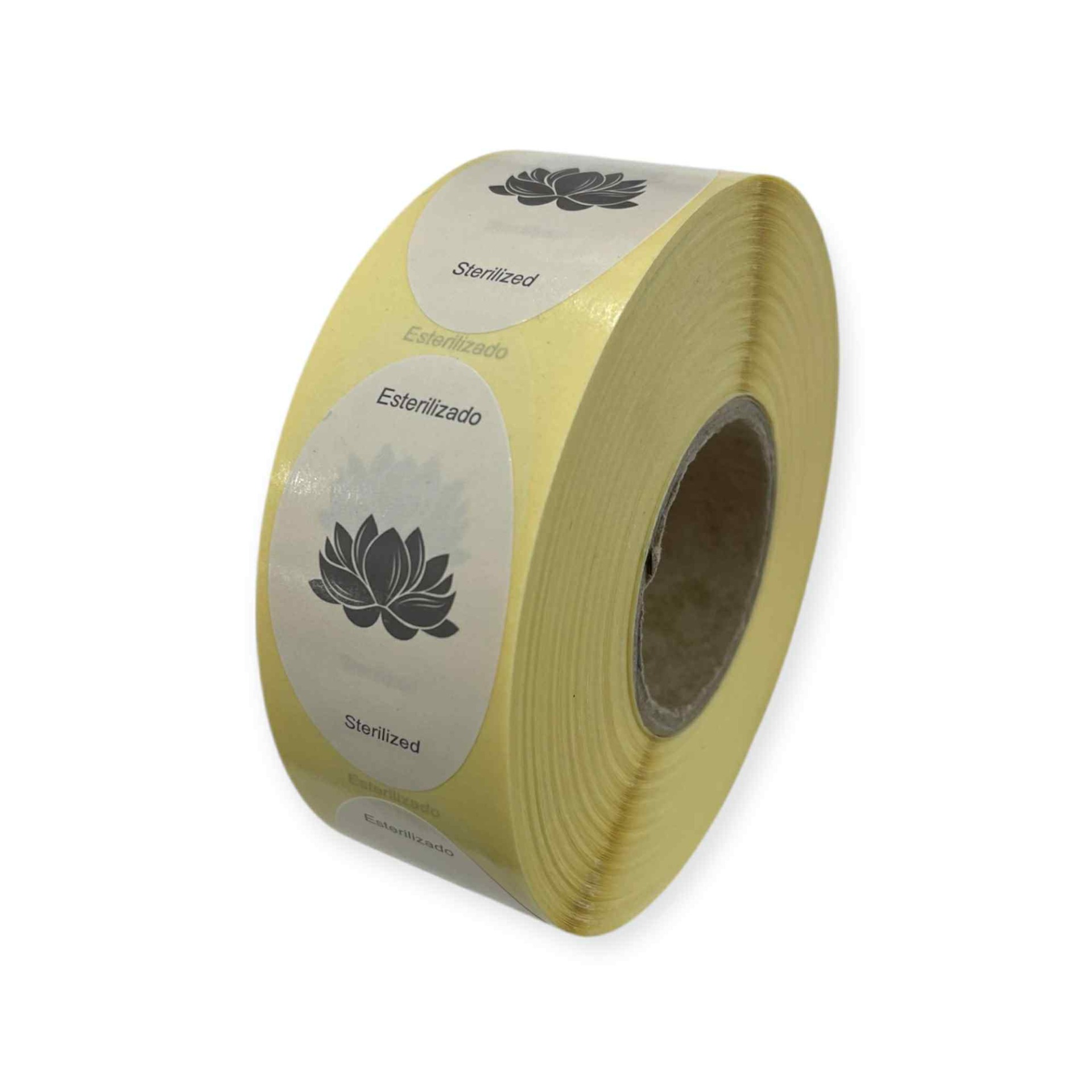 Self-adhesive toilet seal made of laminated paper with the inscription "Sterilized."